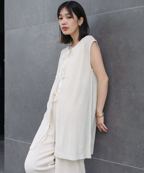 さらりとした素材感のサマーニットTOPS。 表面が凹凸感のある表情でシンプルな装いでもコナレタ印象に仕上げてくれます♪ BACKリボンにしてシンプルに着ても、リボンを解いて羽織るとジレとしても使って頂けます。 肩幅は広めで、落ち感がある素材感なので着になる腕回りを程よく隠してくれます。 同素材のパンツ(品番:5525101)とのセットアップコーデもオススメです。