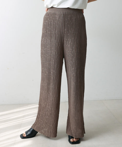 さらりとした素材感のサマーニットパンツ。 表面が凹凸感の表情で、 どうしても夏のコーディネートは楽ちんな着こなしになりがちですが、凹凸感のある編地のニットパンツなので、ロゴTやシンプルなTOPSに合わせるだけで素材感があるのでメリハリのある着こなしに仕上がります♪ 同素材のTOPS(品番:5525091・5525111)とのセットアップコーデもオススメです。