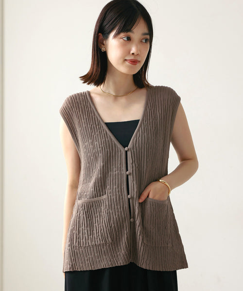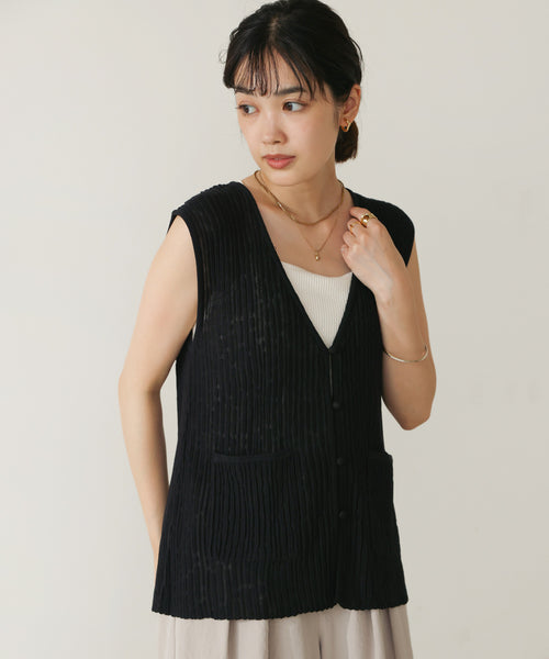 さらりとした素材感のサマーニットベスト。 表面が凹凸感のある表情でシンプルな装いでもコナレタ印象に仕上げてくれます♪ 前を閉めてTOPSのように着こなしても、カットソーに合わせてベストっぽく着ても◎ 同素材のパンツ(品番:5525101)とのセットアップコーデもオススメです。