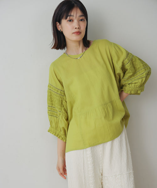 夏らしい軽い素材を使用したブラウスは袖の刺繍がエレガントな印象を与えてくれます♪