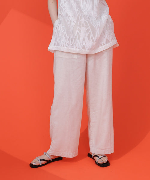 ナチュラルな風合いでラフな雰囲気を演出するシンプルデザイン。すとんとしたストレートシルエットが、レッグラインをすっきりと見せてくれます。ウエストはバックゴム仕様になっているので、ストレスフリーな穿き心地も嬉しいポイントです。