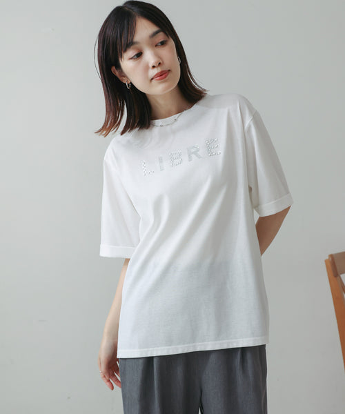 キラキラビジューパールロゴがエレガントなロゴTシャツ。 箔プリントの上にパールとビジューをあしらい、キラリ感が際立つデザインTに仕上がりました。 袖口のロールアップがカジュアル感にこなれ感をプラス。 身体のラインを拾わないサイズ感で、1枚でも安心して着られます。