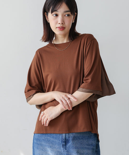 フレア袖カットソー×光沢ビンテージサテンが大人キレイメなプルオーバー。 夏にもデイリーに着られる嬉しいカットソー素材。 ビンテージサテンとの組み合わせがお出かけにもぴったり。 バックにファスナーを使用することでよりブラウス見えなデザイン。 ジャンスカ合わせもしやすいサイズ感と、袖ボリューム感がいつものコーデに華やかさをプラスします。