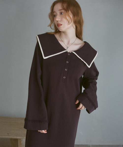 大きめの襟が印象的なスウェットワンピース。 2枚仕立てのビッグカラーに別地のパイピングを手間をかけることで、カジュアルさの中に上品なアクセントをプラスしました。 フロントボタンやバックのスリットがシルエットに抜け感を与え、すとんと落ちるシルエットは女性の体のラインを拾いすぎず、リラクシーでありながららしい印象に。
