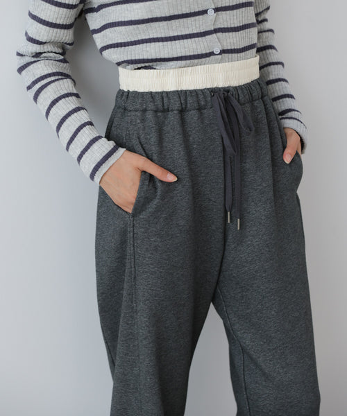 ほどよいボリューム感のカーブシルエットが、こなれ感を演出するスウェットパンツ。ダブルウエスト風のバイカラーデザインがポイントで、シンプルながらも洒落見えする一枚です。ラフさの中に“大人かわいい”抜け感をプラスし、カジュアルスタイルをアップデート。おうち時間や休日のリラックスコーデにもぴったりな、リラクシーなアイテムです。