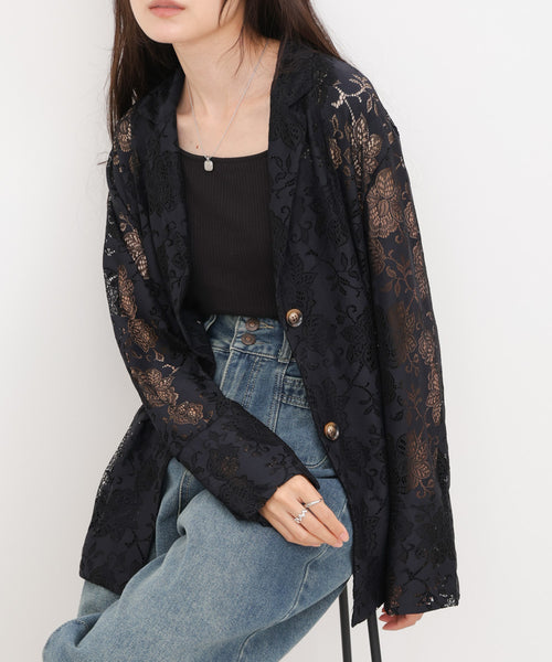 秋にぴったりなレースジャケットが登場!肌寒さを感じる時期に大活躍する薄さになっています。まるでカーディガンのように軽く着ていただけるもポイントです。さらに腰回りまでカバーする長めの着丈でラフにお召しいただけます。体の線を拾わないゆとりのあるサイジングで きちんと感がありながらもリラックス感のある着心地を実現しました。