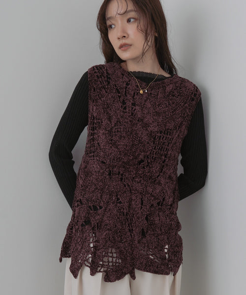 クロシェシリーズの冬仕様からチュニックベストが登場!モールヤーンで繊細なボタニカル柄を編んでいます。着るだけで優しく、フェミニンな印象を与えてくれます。丈感は通常のベストよりも長めに作られているので、ジャケットなどと合わせてレイヤードスタイルをお楽しみいただけます。1枚着るだけでも暖かいので秋冬のベストとして大活躍間違いなしのアイテムです。