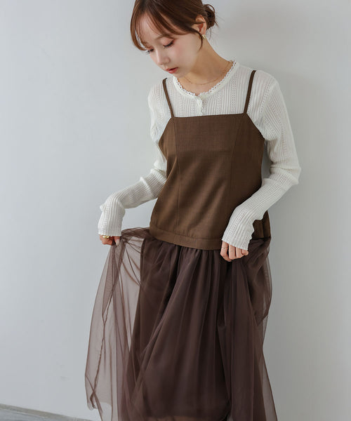 レイヤード風のデザインにチュールスカートを重ねた、華やかさ満点のキャミワンピース。ふんわり広がるチュールが軽やかに揺れ、歩くたびに女性らしい雰囲気を漂わせます。シンプルなトップスに重ねるだけでコーディネートが完成する存在感のある一枚です。S・M・Lの選べるサイズ展開で、体型や好みに合わせたシルエットが楽しめるのも嬉しいポイント。アイボリーは淡色コーデにやわらかな甘さをプラスし、チャコールは大人っぽく上品な印象に、ブラウンは落ち着きとクラシカルさを引き立てます。オンオフ問わず活躍する、主役級アイテムです。