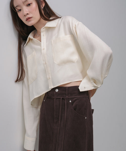 バックスタイルがポイントのショートシャツが登場!フロント部分はシンプルに、バックスタイルは目を引くデザインに仕上げました。バック部分は大胆にタックを加え、生地にレーヨンを足すことでフェミニンさを演出しています。1枚でデザイン性のあるシャツになっているのでお持ちのデニムやスラックスなどシンプルなボトムスと合わせて着ていただけます。胸元部分にポケットがついていて実用性も兼ね備えたデザインシャツになっています。