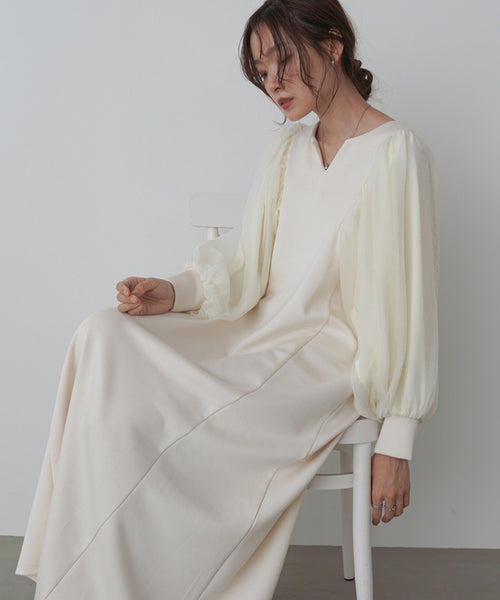 夏に人気だったオケージョンにも使えるワンピースが秋冬仕様になって登場です!ふんわりとしたシアーのボリュームスリーブと控えめなキーネックが柔らかい女性らしさを演出するワンピース。後ろ開きが無く、Tシャツ感覚で楽に着脱できるのも嬉しいポイントです。