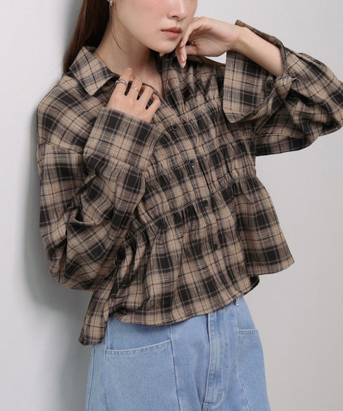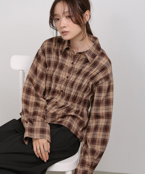 春に人気だったブラウスが秋冬仕様になって登場です!胸元部分に施されたシャーリングがアクセントになっていてカジュアルさにフェミニンを加えたシャツに仕上がっています。シャーリング部分にはゴムが入っているので伸縮性もしっかりあります。今年トレンドのチェック柄を取り入れたカラーでオンオフ問わずにお使いいただけるデザインです。