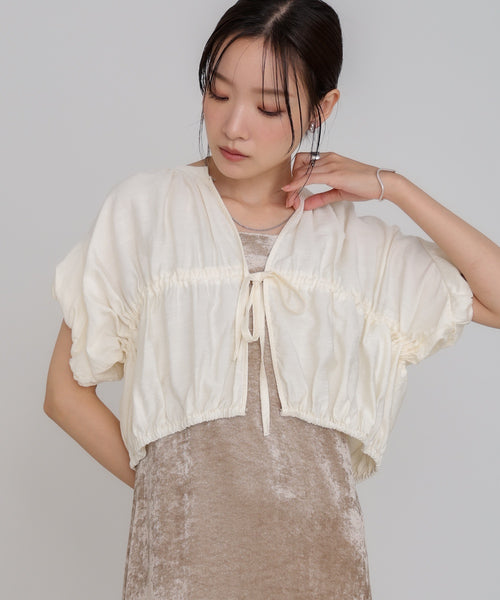 羽織としてもベストとしても使える万能アイテムの登場です!電車の中や会社の中など室内で寒さを感じるときに羽織として使うのにちょうど良い厚さと生地感になっています。中央部分にギャザーが集まっていてウエスト部分が絞れるのもポイントです。袖の部分はふわっとしていて広がりすぎないバルーン袖になっていて、トレンドライクな形になっています。1枚でベストの役割にもなるので、1枚二役で今の季節に大活躍間違いなしです!