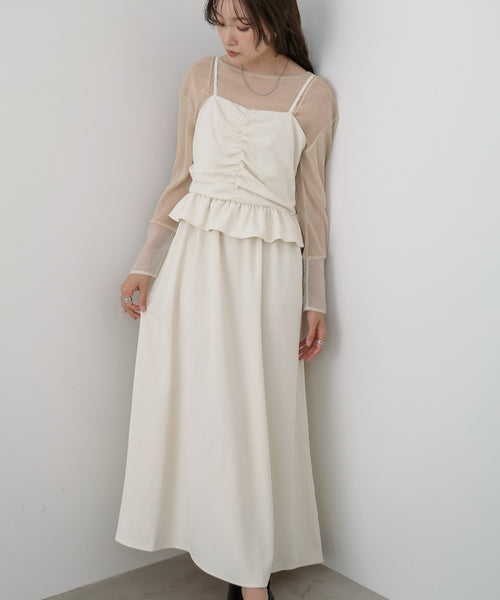 ウエスト部分のフリルとギャザーがポイントのキャミワンピが登場!まるでオケージョンワンピを日常使いできるキャミワンピに落とし込み、フェミニン要素を加えて仕上げました。ウエスト位置からふわっと広がるスカート部分は、落ち感が綺麗で上品な印象を与えてくれます。上身頃はギャザーを寄せてシルエットが綺麗に見えるように仕上げています。一癖あるフェミニンなムードあふれるワンピースになっています。