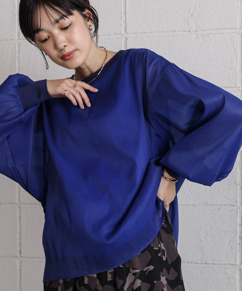 繊細な光沢のあるシアー素材とカットソーでレイヤードしたプルオーバー。 程よいドロップショルダーとアームで大人のゆるっと感を出しました。 一見シンプルに見えて、お袖のボリューム感やシアー感でフェミニンさ を程よくプラスしてくれるプルオーバーです。 すこしきちんと感も出したい時にピッタリです。