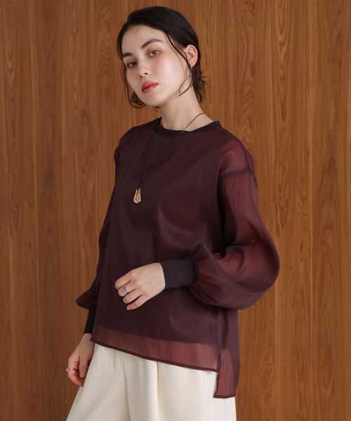 繊細な光沢のあるシアー素材とカットソーでレイヤードしたプルオーバー。 程よいドロップショルダーとアームで大人のゆるっと感を出しました。 一見シンプルに見えて、お袖のボリューム感やシアー感でフェミニンさ を程よくプラスしてくれるプルオーバーです。 すこしきちんと感も出したい時にピッタリです。