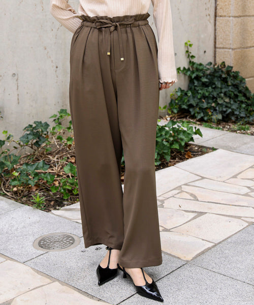 ドロストウエストパンツ。細すぎず、ふと過ぎないセミワイドシルエットで、なんにでも合わせられて、カジュアルにもきれい目にも活躍します。 ウエストのゴムはソフトで、たっぷりととったダブルタックで渡りとヒップはゆったりとっています。 落ち感のある生地を使用することで、ひろがらずに、すっきりときれいに着こなして頂けます。 ウエストのゴムにドロストが通っているた為、ウエストサイズを自由に調整可能。