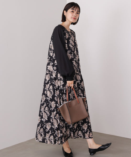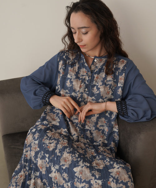 程よい透け感のあるシアージャガード生地にぼかしたフラワー柄をプリントした生地を使用し、素材で奥行き のある秋のムードを出しました。お袖は微光沢なサテン素材を使用し、素材のコントラストをお楽しみ頂けます。
