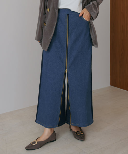 フロントZIPの開閉で、前から見るとスカート、後ろから見るとパンツというユニークなデザインに変化。 ひと味違う着こなしが叶う1本です。配色デニムが縦のラインを強調し、自然とスタイルアップ。 ストレートシルエットが脚をすっきりと見せつつも、程よくゆとりがあるから動きやすさも◎。 カジュアルなのにどこか品があり、Tシャツにもブラウスにも好相性です。