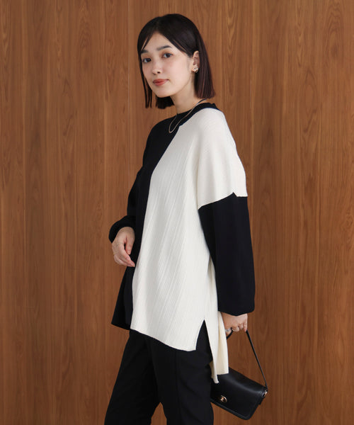 モダンな配色でサインが目を引く、センス漂うチュニック。 ほどよよくゆったりとしたシルエットで、体のラインを拾わずリラクシーな印象に仕上がります。 ネックから裾にかけて落ちる配色切り替えが、縦ラインを強調して、スタイルアップ効果も引きたてます。