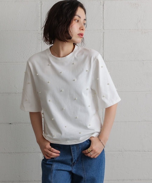 総柄のようにパールやスタッズがちりばめられた価値感のあるカットソー。 1枚でデザイン性がありますが、主張しすぎないデザインがサロペットやキャミソールデザインとのレイヤードスタイリングに重宝します。 重ね着がしやすいように、小さすぎず大きすぎない程よいサイズ感。袖丈は気になる肘周りもカバーできるほどのハーフスリーブで、これからの長い夏に使えるアイテムです。