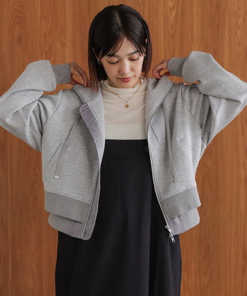 レイヤードしたような着こなしになるアウター。短めのアウターの着丈がトレンドのクロップド丈なので、羽織るだけで足長に見せてくれてスタイルUPが叶うアイテムです。 キレイめなカットソー素材を使って、ところどころMA-1デザインがちりばめられているので程よいMIXコーデに仕上がり、カジュアルはもちろん、きれいめスタイリングのあえての外しの着こなしにもオススメです。 カットソー素材なので、伸縮性がある分着心地もよくラクに着て頂けます。