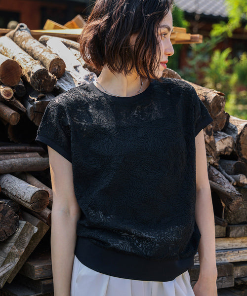 凹凸感のあるコード刺繍レース生地を使用したプルオーバー 立体感のある表面感が大人可愛いレース生地に襟ぐりと裾には 光沢のあるポリエステル糸を使用したニットで編み立てた シンプルながらも細部に拘りのあるプルオーバー シンプルなタイトスカートに合わせて大人シックなコーデに カーゴパンツやデニムなどのカジュアルパンツに合わせた甘辛MIXコーデにも◎