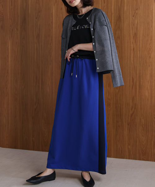 カットソージョーゼットを使用したストレッチ抜群の ストレスフリーなIラインスカート サイドラインが視覚効果で着やせも叶う! ストレッチ生地+ウエストはぐるりゴムなので着脱も楽チン! 細い方はウエストの紐もあるので閉めて調整可能 幅広い体型の方にオススメ 中肉素材で長い時期着用可能でどのTOPSにも合わせやすく 着回しアイテム BLACKのみセットアップも可能なのでちょっとしたお出かけから 食事会や気張らずにカジュアルフォーマルにも活躍!