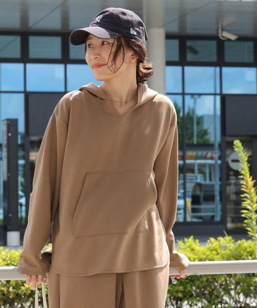 はあちゅうさんとのコラボで生まれた、柔らかくも程よく張りのある段ボール素材のVネックパーカー。深すぎないネックラインが、カジュアルすぎず、知的な印象を演出します。スマホや小物がすっと収まるカンガルーポケット付きで、移動中も快適。 パーカーのフードは機内での睡眠の際、アイマスクがなくても目元が隠れるデザインです。
