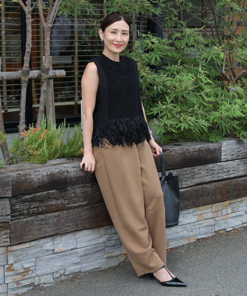 柔らかな段ボール素材を使用したカーブパンツは、軽やかな履き心地と、内側に施したダーツによる自然な曲線が魅力。立体感のあるシルエットが、ほどよく抜け感を演出し、どんなトップスとも相性抜群です。 股上はやや深めに設計されており、ウエスト位置の調整がしやすく、丈感にも融通がきくのが嬉しいポイント。