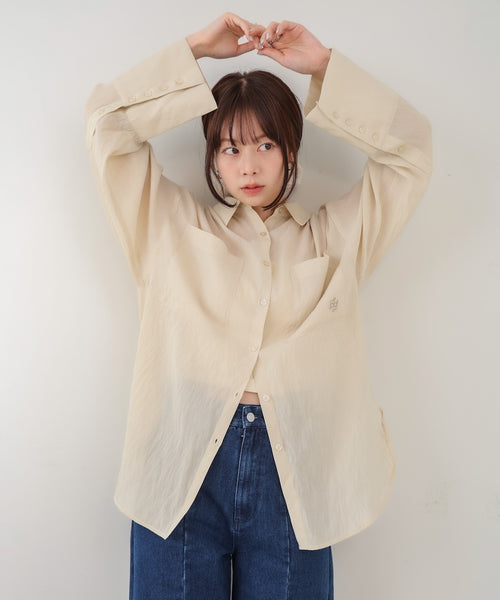オリジナルワンポイントの刺繡がポイントのシアーシャツが登場!両胸元部分にはポケットもついていて、可愛さだけでなく機能性も抜群なアイテムになっています。丈感はあえて長めに作られていて、パンツやスカート、ワンピースのどれと合わせても映えます。ワンピースと合わせてもシアー素材なので抜け感があり爽やかな雰囲気になります。一枚持っておくだけで使いまわし抜群です!