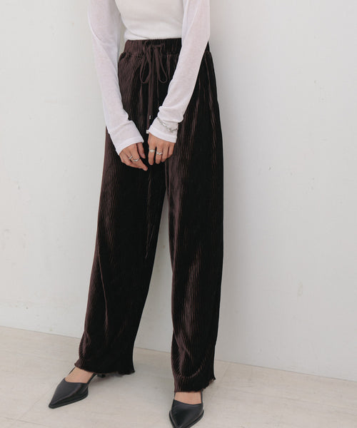 光沢感あふれるベロアパンツが登場!ベロア生地が上品さを引き立てる一方でウエスト部分はゴムで仕上げる事でラフに着ていただけます。薄手のカットソーだけでなく、ニットやべロア素材のベストなど様々な素材と合うので何にでも合わせやすいのがポイントです。