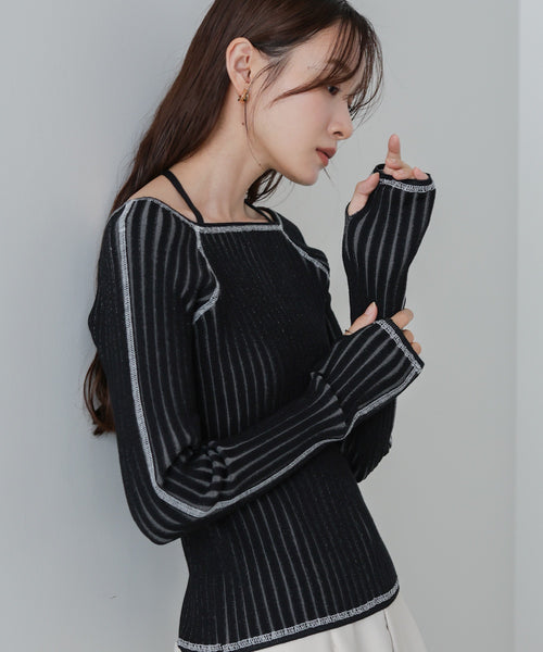 繊細な配色ステッチが目を引くスクエアネックニットトップス。首元には取り外し可能なリボンがあしらわれ、フェミニンな雰囲気を気分に合わせて楽しめます。アイボリー・杢グレー・ブラックの3色展開で、ベーシックながらも華やかさのあるデザイン。サムホール付きで今季らしいディテールを取り入れつつ、秋冬シーズンに映える大人フェミニンな一枚です。