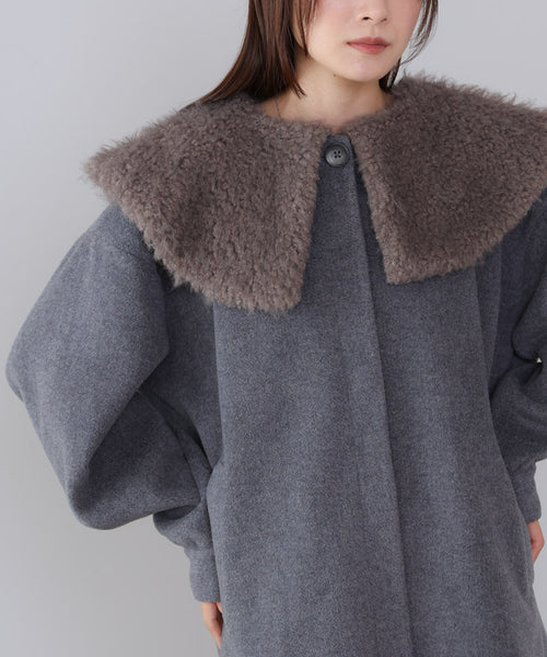 ふんわりとしたボア風の襟が目立ち、2WAYビッグカラーハーフコート。 襟は取り外し可能で、シーンに合わせて印象変化が叶います。 しっかりとしたビッグカラーが顔まわりをやさしく包み、女性らしい抜け感をプラス。 ボタン仕様で重厚な雰囲気もあり、通勤にもデイリーにも活躍します。