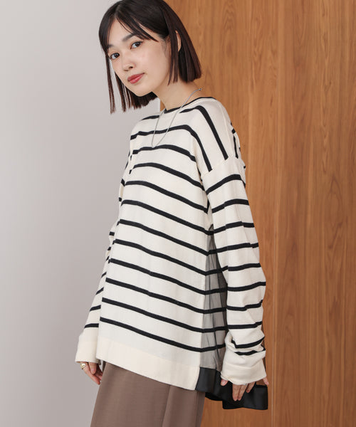 前はシンプルなニット、後ろはチュールを切り替えで後ろ姿までかわいいデザイン。動くたびにふんわり揺れるチュールが、女性らしさを引き立ててくれます。無地とボーダーの2パターン展開で、テイストに合わせて選べるのもポイント。ボーダー柄は大人の女性でも着やすいよう、ピッチや配色にこだわりました。