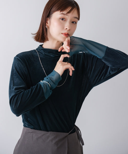 毎年人気のベロアインナーが、今年は新色を加えて登場! 光沢を抑えたほんのりシアーなベロア素材で、大人の女性が着やすい上品なトレンドアイテムです。 表側は滑らかなベロア、内側はメッシュ素材で肌あたりも優しく快適な着心地。 袖口には柔らかいチュールを重ね、くしゅっとしたギャザーがレイヤードスタイルに抜け感をプラスしてくれます。 ニットやワンピースのインナーとして、袖口までオシャレに仕上がる一枚です。