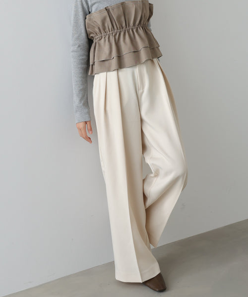 ハンサムなツータックで脚長効果を発揮するキレイめスラックスが登場!ウエストの華奢見えも期待できる適度なハイウエストで、さらにすっきりしたシルエットが叶います。ワイドシルエットながら きちんと感を演出するセンタープレスを入れることで、キレイめなパンツスタイルを確立できる1本になりました。