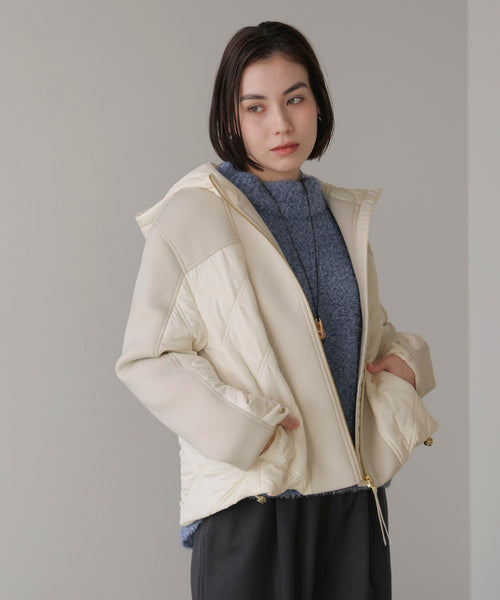 キルティングと、滑らかなダンボール素材を組み合わせた上品なフーディアウター。 軽い着心地ながらもしっかりと暖かく、デイリーに活躍する1着です。 立体的なフードが顔まわりをすっきり見せ、サイドの切替デザインが自然なシルエットを演出。 カジュアルすぎず、大人のスタイリングに馴染む洗練された表情が魅力です。 ワンピースにもパンツにも合わせやすく、冬のアウターとして長く愛用していただけます。