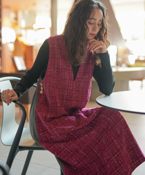 Vネックジャンパースカートワンピース。フロントの深めのVと 前後の素材感とデザインのコントラストがインパクトのあるデザイン。 前から見たときにすっきりと見せるようにダーツを入れてシルエットを際立出せました。後ろはギャザーリングとバックベルトでフェミニンな印象。両サイドのボタンがアクセントです。 シンプルなリブニットやシアートップスとの重ね着をおすすめします。