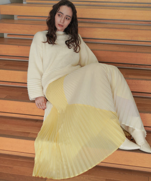 程よく美しい微光沢のある生地をカラーブロッキングして縫製後に、アコーディオンプリーツをかけて、アシンメトリー な曲線で遊んで、モダンに仕上げたプリーツスカートです。裾巾をふんだんにしようし、たっぷりとした足さばきが 寒い時期の足元を華やかに演出してくれます。ふわっとしたあったかなニットの愛称が良く、色の組み合わせで、 フェミニンにもスマートにも着こなして頂けます。 前後のデザインも異なるので、前後をチェンジしてお楽しみ頂けます。