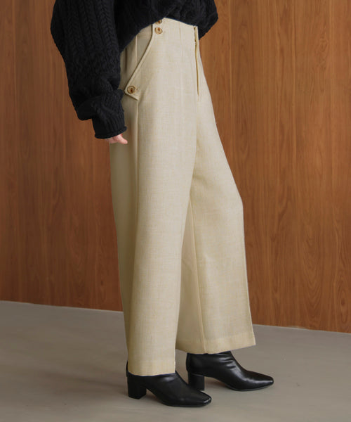 前後で異なる素材を組み合わせたセミワイドパンツ。両サイドのボタンとポケットがデザインアクセント。 いつもより少し短丈のパンツは、ブーツとの相性ばっちりで、足元が重たくなりすぎず、すっきりと着こなして 頂けます。着脱は、フロントダブルフックとファスナー開きで、後ろゴム仕様で、きちんと感がありながら、履き やすさにもこだわりました。