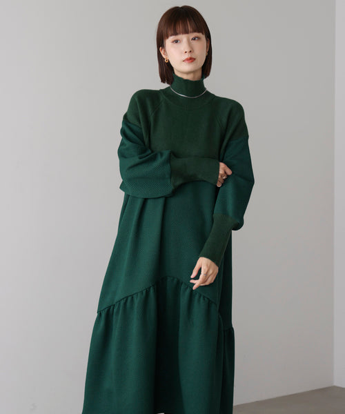 ふわふわのニットと、ぷっくりとした幾何柄の生地を切りかえた、表情豊かなドッキングワンピースです。異素材の組み合わせが、シンプルになりがちな冬の装いに“ちょっと特別なかわいさ”をプラス。首もとをやさしく包むタートルは、ほっとするあたたかさで寒い日のお出かけにも頼れる存在です。裾に向かってふわりと広がるシルエットは、甘すぎないのに女性らしいラインをつくり、大人の女性が自然に楽しめる上品さがあります。