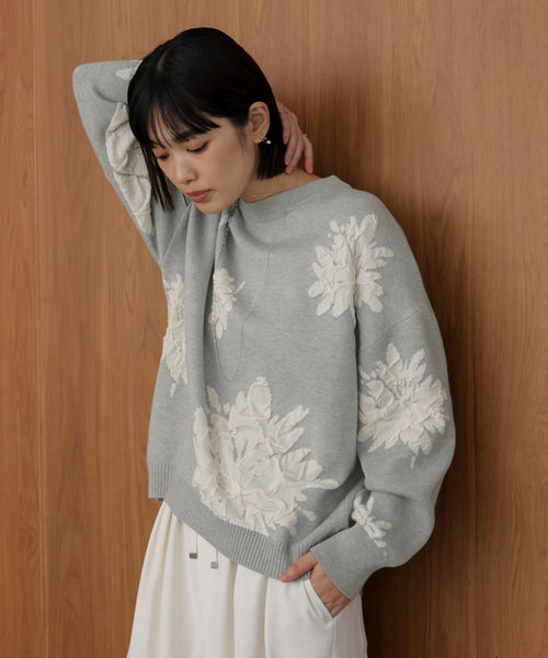 大人気カーディガンから、待望のトップスが登場。 印象的なフラワーモチーフはそのままに、1枚で着映えするデザインに仕上げました。 カーディガン同様、柄部分は袋編みで立体感があるのも魅力。ゆったりとしたドルマン袖と、程よいゆとりのある身頃が、リラックスした大人の着こなしにぴったり。