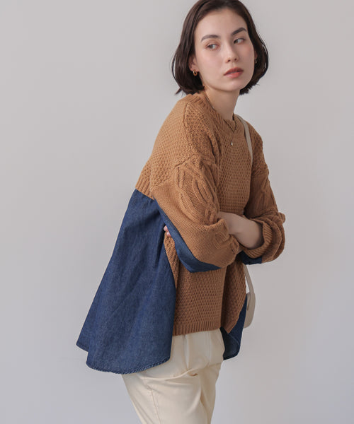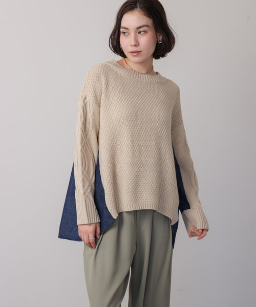 デニムの軽やかさと、ニットのぬくもりをひとつにしたAラインプルオーバー。 6オンスの明るいブルー系デニムを切り替えにあしらい、さりげないアクセントを作っています。 身頃はやわらかなかのこ編み、袖は立体感のあるケーブル編み。表情の違う編み地が重なり、シンプルなのに“少し特別”な印象に。 ゆるやかに広がるAラインシルエットは、気になる部分をそっとカバー。後ろが少し長めのデザインで、動いたときもきれいなラインを保ちます。