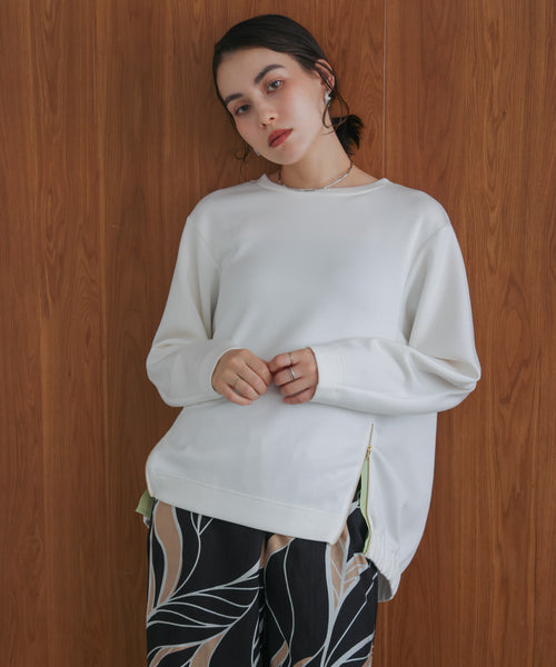 BACKドレープできれいなコクーンシルエットになるようにこだわったカットTOPS。 ちょうどヒップを隠してくれる着丈で、キレイなコクーンシルエットなので全体的にすっきりと見せてくれます。 裾のファスナーはキラリと光ってポイントにもありますが、開閉によってシルエットを変化させてくれます。 着こなしはコクーンもキレイに見せるようにタイトスカートなどのすっきりしたボトム、フレアスカートやワイドパンツなどのボリュームボトムとも相性◎です。 ファスナーを開けた時にチラッと見えるカラーテープもさりげないポイントです。