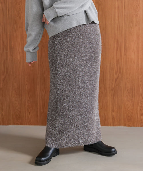 シャギー感のあるラメで編み立てたニットのタイトスカート。 ラメ感とふんわりとしたシャギー素材がこれからのシーズンムードを高めてくれるアイテム☆ タイトスカートでもニット素材なので伸縮性があり、楽ちんに着て頂けます。 これからの季節のざっくりしたニットや、ゆるっとしたシルエットのTOPSにもスタイリングするだけでバランスが取れて、素材感でも抜け感がでるのでコーデに活躍間違えなしのアイテムです。