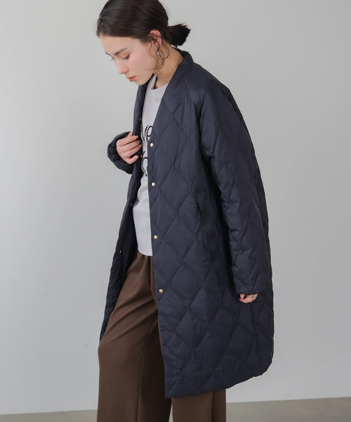上品な光沢感のあるナイロン素材にダイヤキルトを施したシックな一着。 特徴的なカルマネックデザインが、着用時に首周りに優しく寄り添い、エレガントな印象を与えます。 ポケット口にはグログランテープを配し、アクセントとなっています。