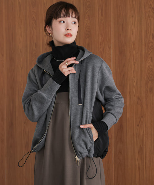柔らかくもっちりとした肌触りで、着心地抜群! カットソーなのにキレイ目なスタイリングにもマッチします。 サイドの布帛使いがシルエットの立体感を演出。 大人カジュアルな印象に 裾は絞って着丈を程良く短くすることでスカートにも合わせやすい! 今年はプルオーバーとして閉めてアウターにINしたレイヤードコーデがオススメ! その際は逆開ファスナーを裾側少し開いて着るとこなれた印象に 細部の金属使いもポイント!