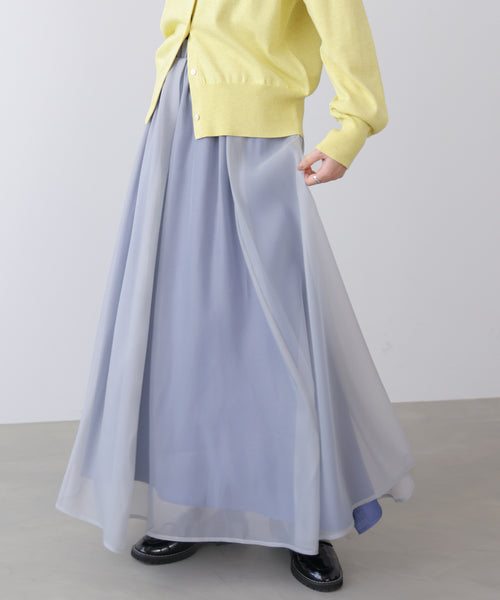 軽やかなシアー素材を重ねたフレアスカートです。表地の透け感を活かし、裏地のカラーがほんのり覗くニュアンスが魅力。動くたびにふわっと揺れて、女性らしさと上品さを引き立ててくれます。ウエストは総ゴムで、ストレスフリーな履き心地も嬉しいポイント。