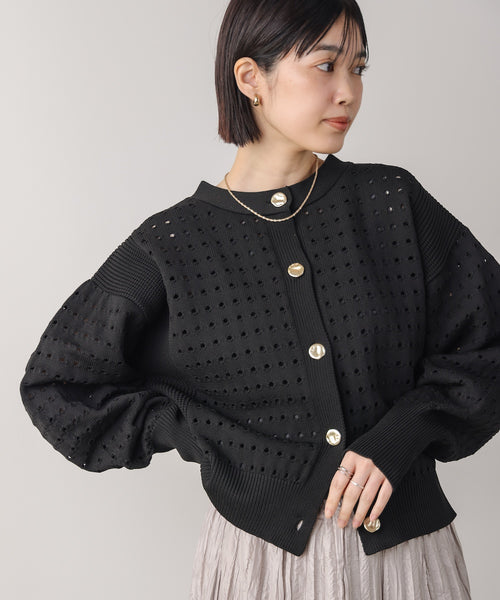 身頃と袖はポリエステル100%の軽量メッシュ編みで、通気性がよくさらりとした着心地。春から夏まで長く使えるので、オフィスやお出かけに重宝します。ふんわり感と軽やかさが両立した、日常にそっと寄り添う一枚です