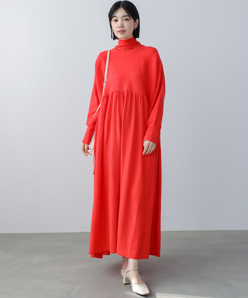 高めの切り替え位置から広がるギャザーデザインが、体のラインを拾わずふんわりとした女性らしいシルエットを演出します。シンプルなハイネックデザインが顔まわりをすっきりと見せ、大人の落ち着いた印象に仕上げてくれます。一枚でコーディネートが完成する高見えワンピースです。